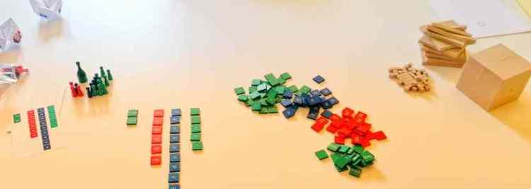 Ainsi nous reprenons avec du matériel Montessori, la frise numérique par la chaîne de 1 000, expérimentons le principe des 4 opérations avec des jetons, timbres, cubes ou perles et le renforçons.