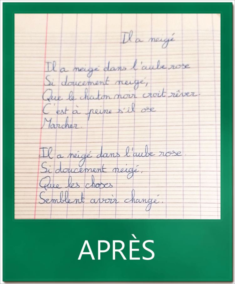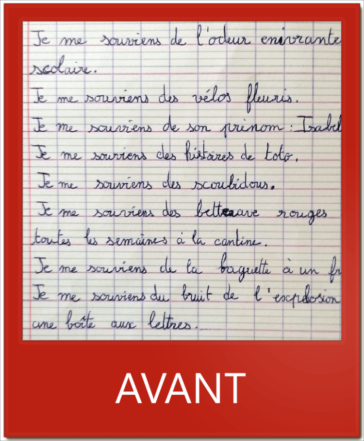 C. avait déjà une bonne écriture qui manquait cependant de fluidité et de rapidité. Elle a revu certaines formes et travaillé la continuité (retrait des attaques en début de lettres, moments où lever son crayon…) afin de gagner en vitesse.