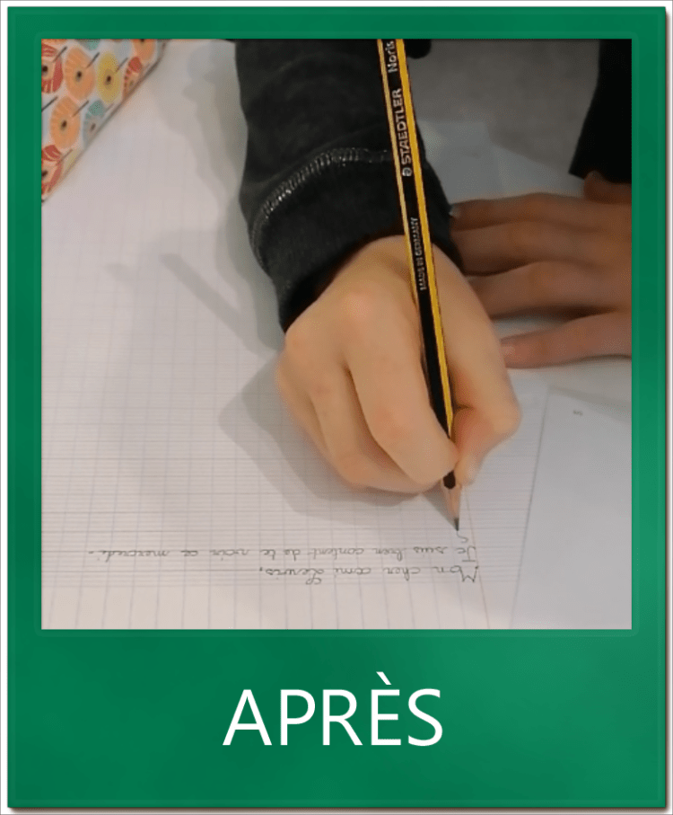 « En seulement quelques séances de rééducation au geste à l’écriture, ma fille de 10 ans a recouvré une bonne tenue de crayon et a pu gagner en aisance et en rapidité; un super atout pour sa future entrée au collège.