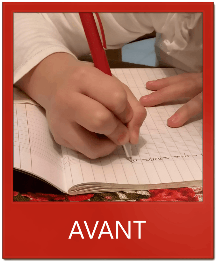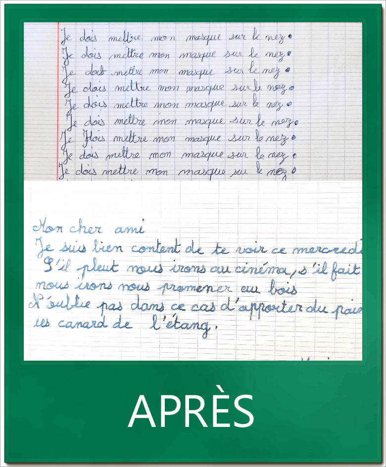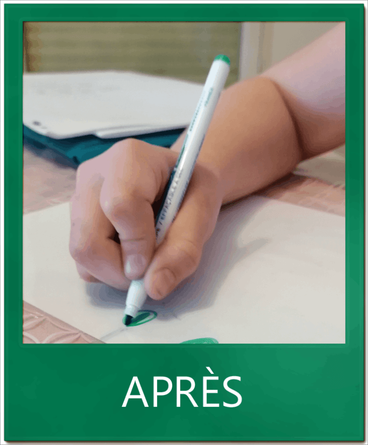 M. 9 ans, a terminé sa rééducation du geste d’écriture qui a consisté à modifier sa tenue et à acquérir un mouvement fluide et rapide lui permettant aujourd’hui d’écrire aisément. Elle a bénéficié d’un accompagnement de qualité de sa famille et de son institutrice.