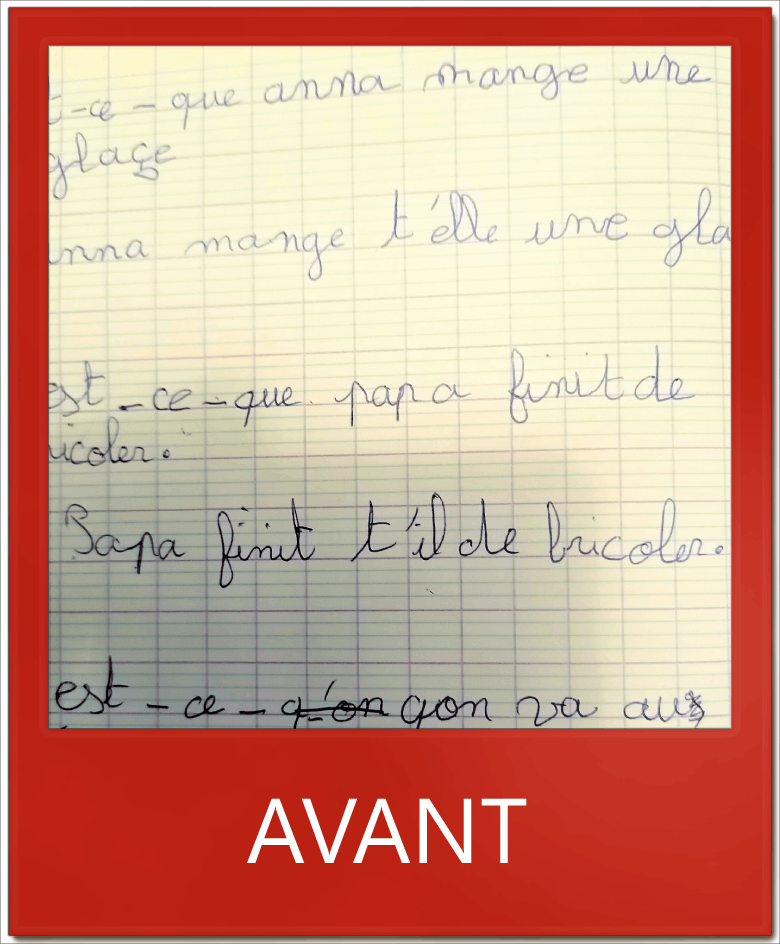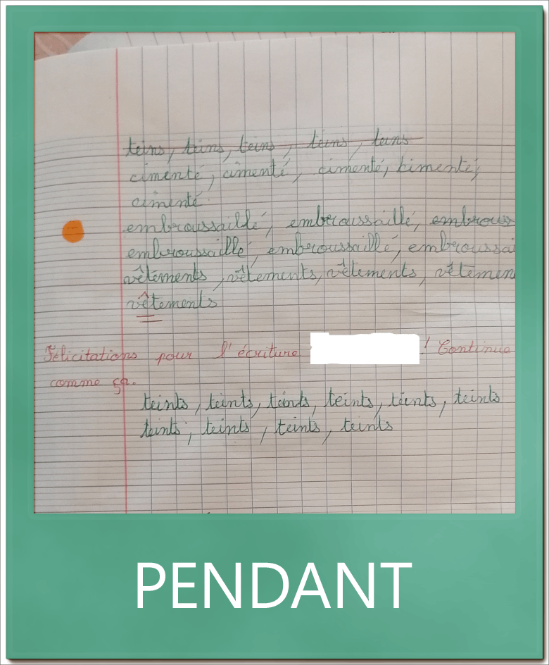 Je l’ai revue une dernière séance pour parfaire les stratégies de copie, ce qui lui a permis de finir avec une vitesse d’écriture adaptée au rythme de classe.