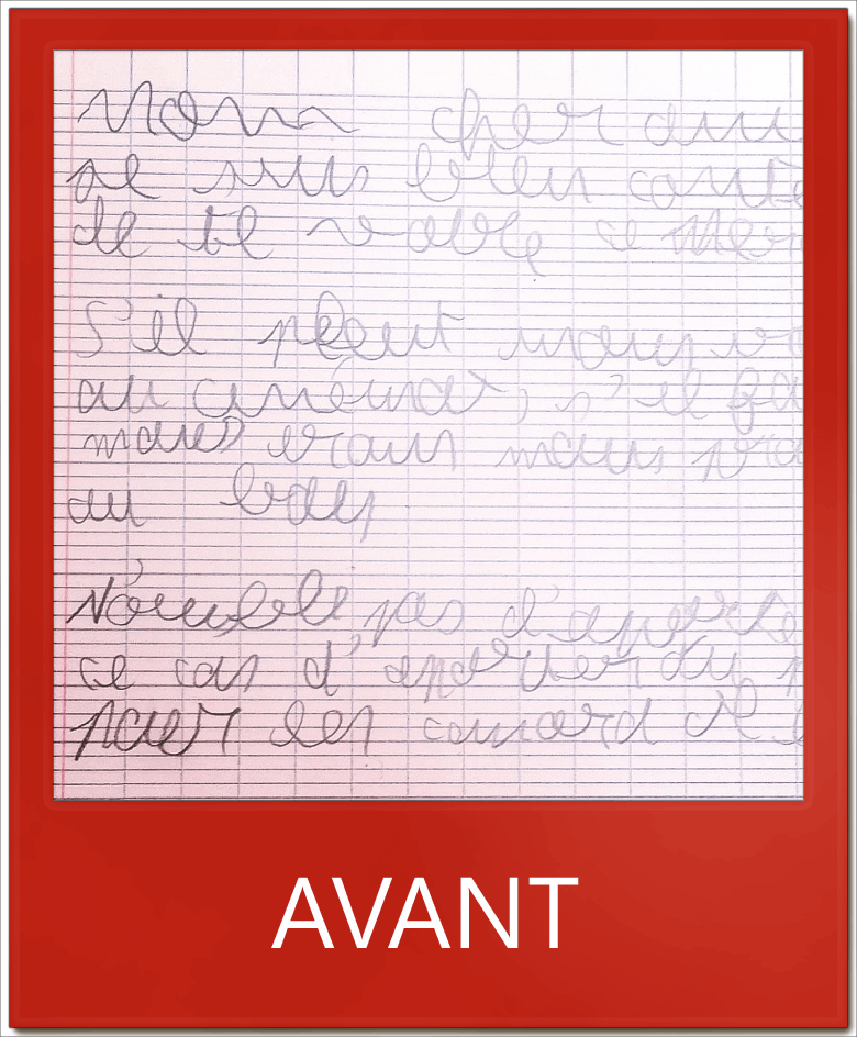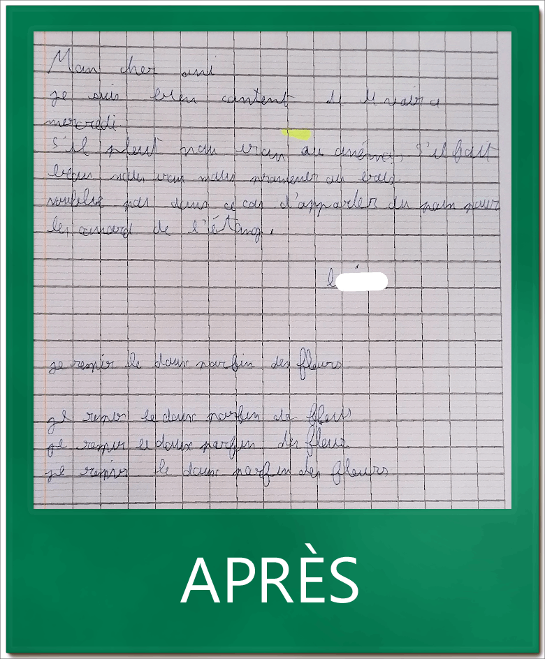 Dans le cas d’une dyspraxie, le geste ne peut pas s’automatiser. Ceci a bien été expliqué à l’adolescent et à sa famille dès le premier échange téléphonique. En revanche on peut améliorer la lisibilité en revoyant la tenue, les formes et en agissant sur la disposition des mots sur le papier (espaces entre les lettres, entre les mots, tenue de ligne).