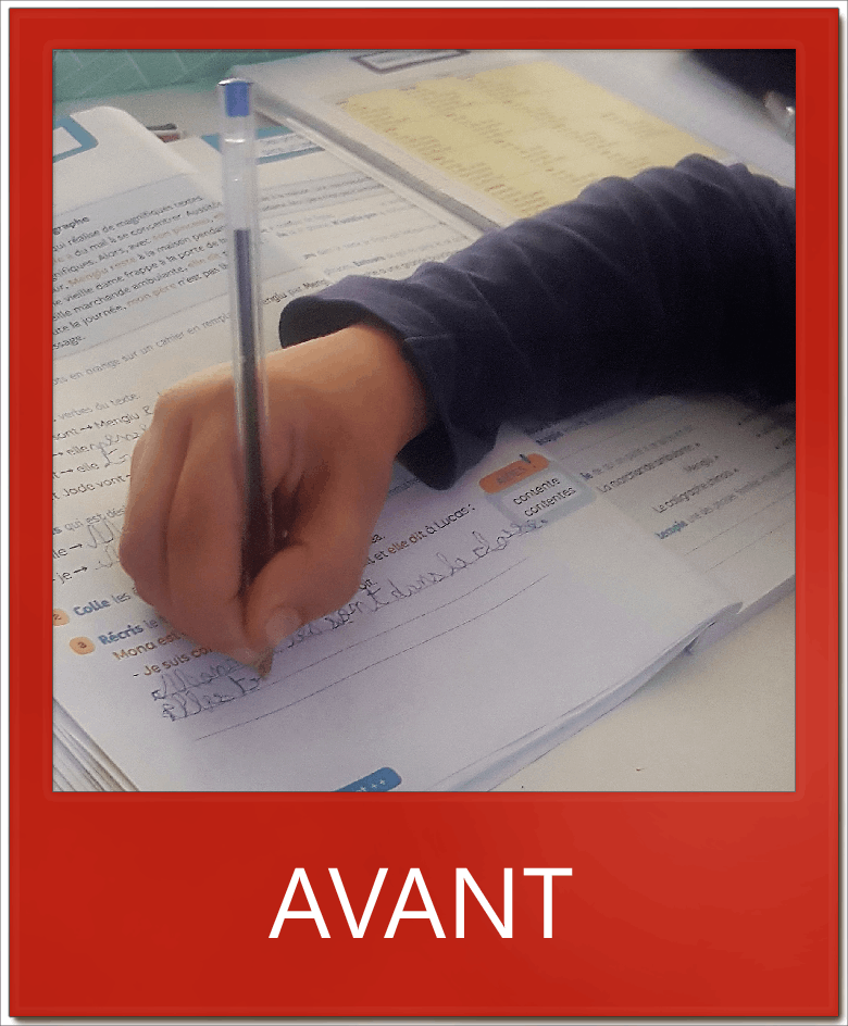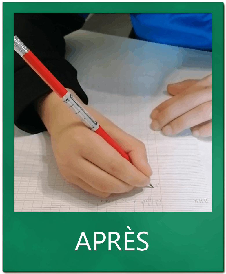 En plaçant sa main sous la ligne d’écriture, en penchant sa feuille et en renforçant la pince pouce-majeur par de petites activités ludiques, il a gagné en aisance et en précision.
