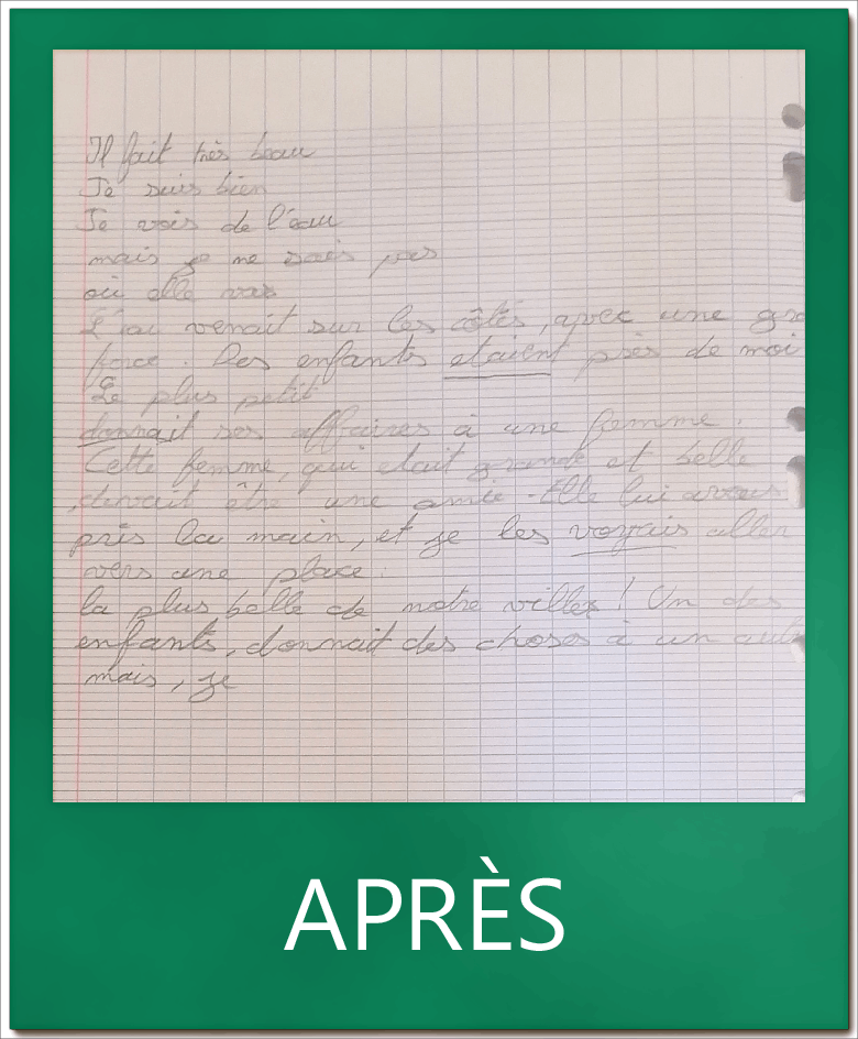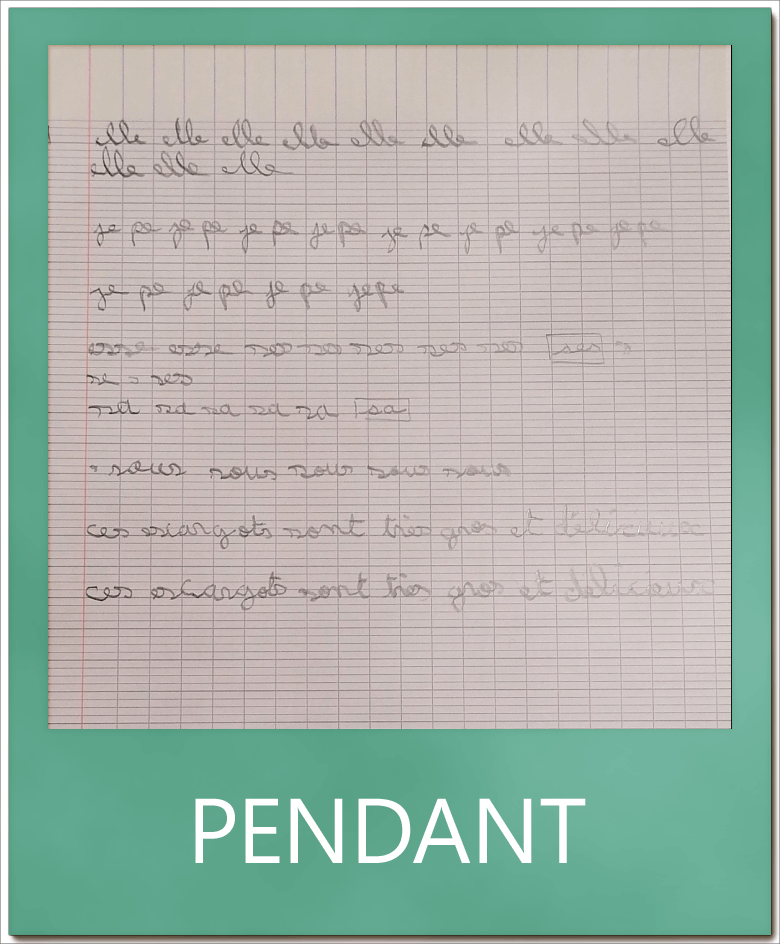 N.en 4ème se plaignait de douleurs et ne parvenait pas toujours à suivre le rythme du collège. En faisant évoluer son écriture, il a su lever ces 2 freins. Bravo à lui !