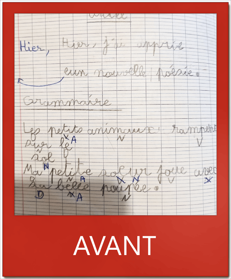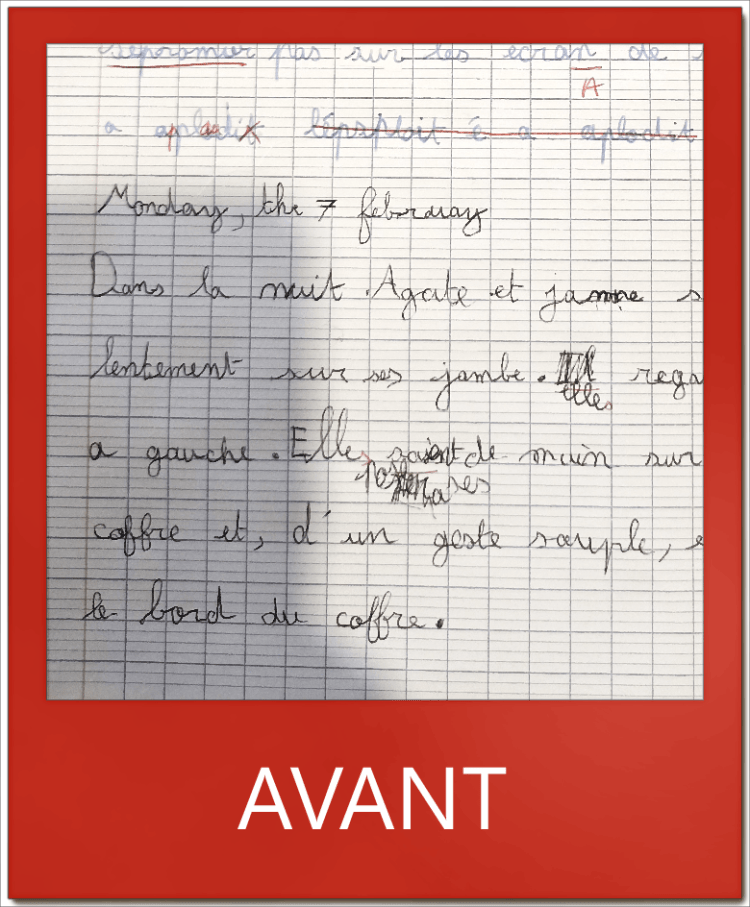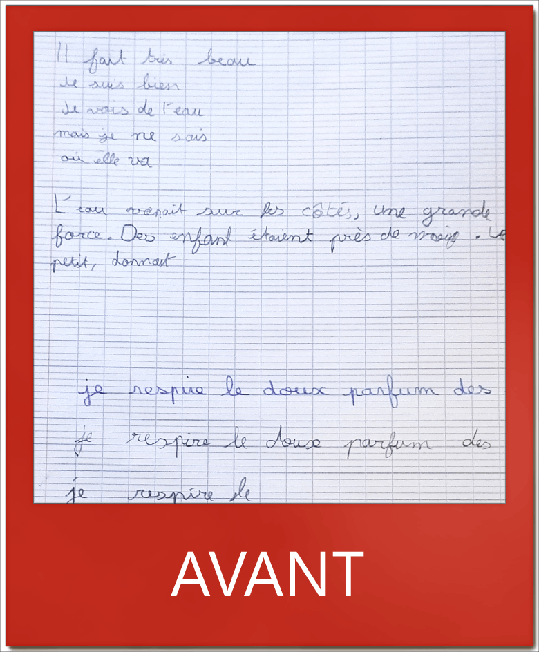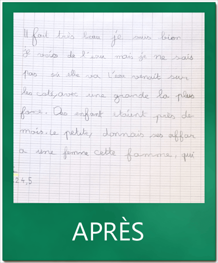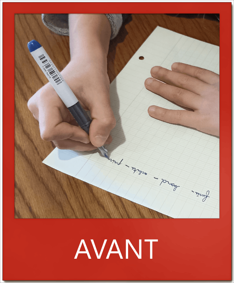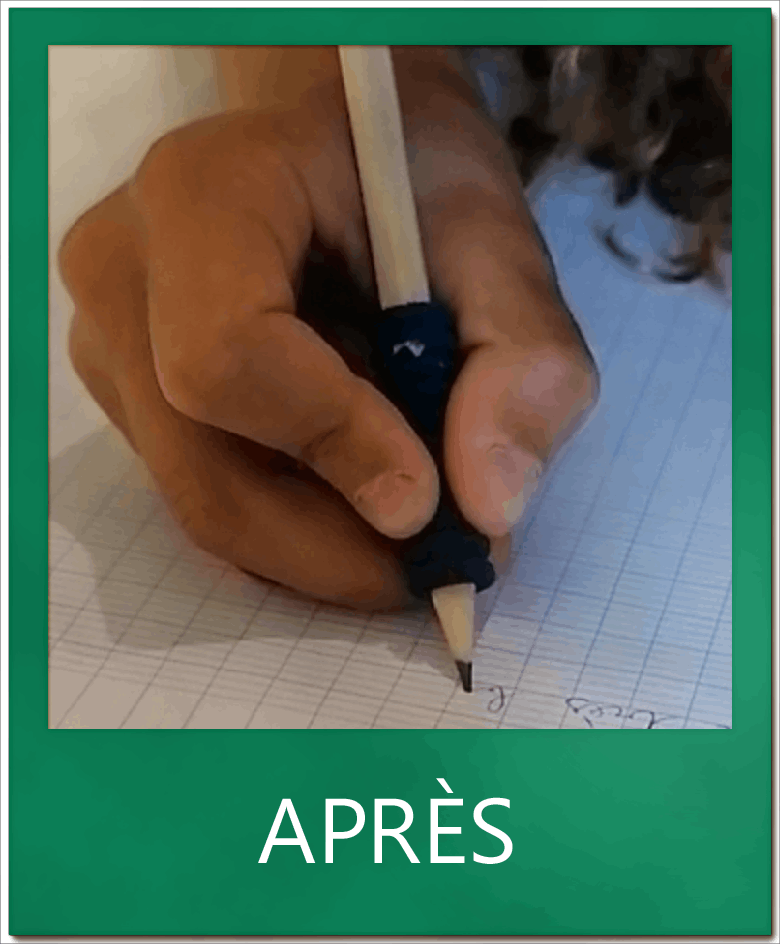 L. en CM1 méconnaissait les règles de conduite de l’écriture et sollicitait son poignet au détriment des doigts. Grâce à une application directe en classe, elle écrit aujourd’hui de façon fluide et rapide. Bravo à elle !