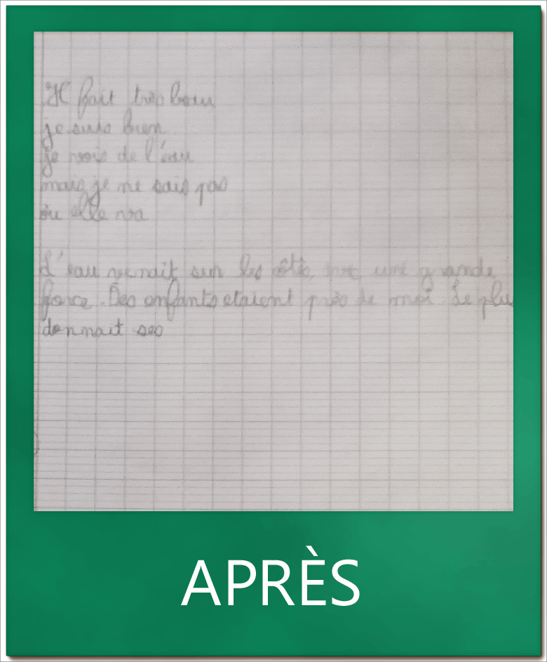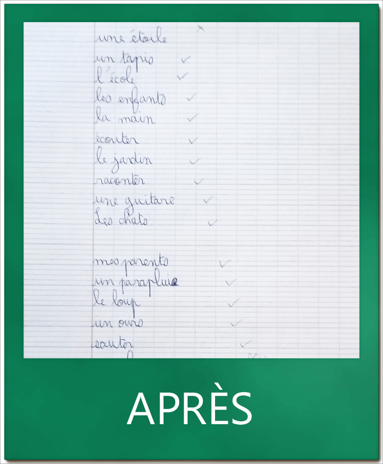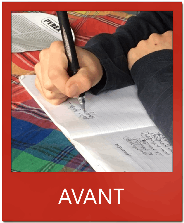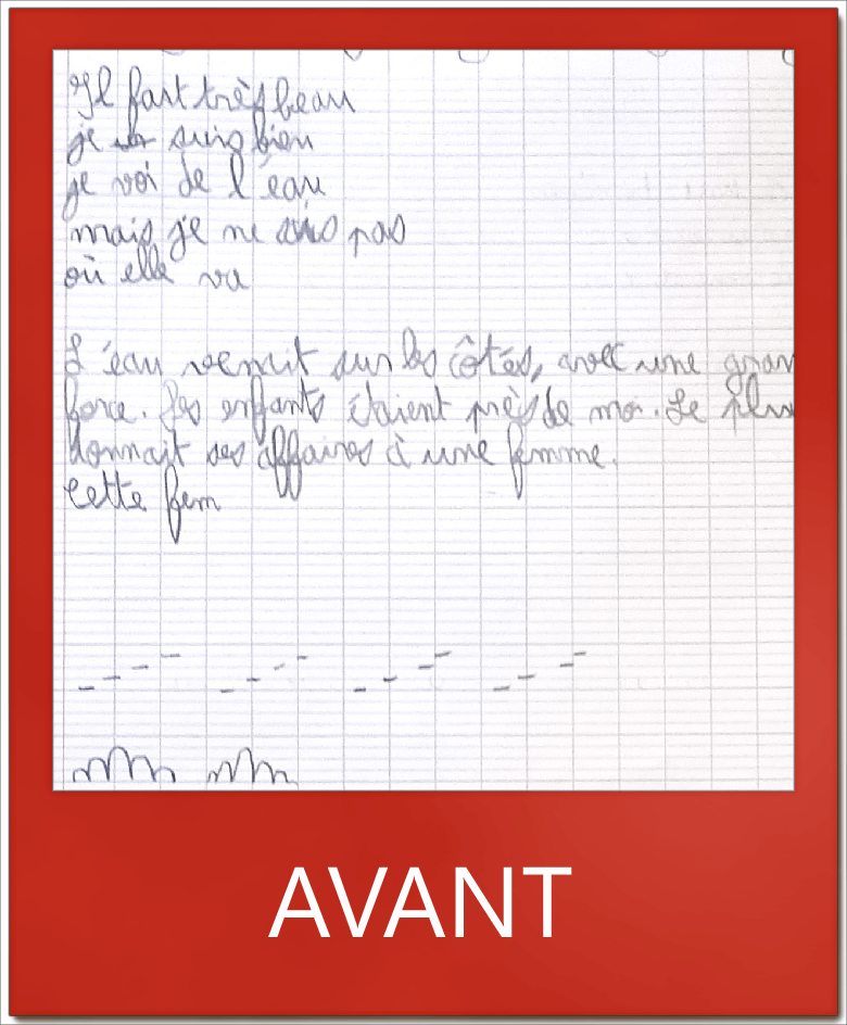 Je suis content de mes progrès : mon écriture est mieux et je ne dépasse plus les interlignes. J’écris plus petit. Avant sur une feuille j’écrivais 3 lettres 🙂 »