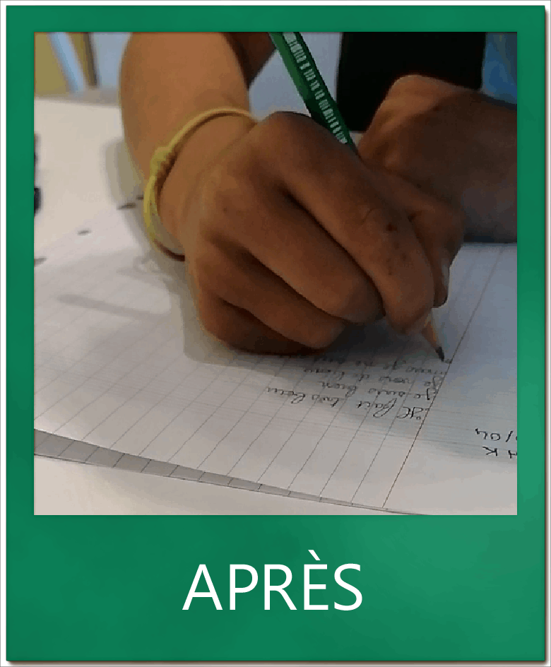 En quelques séances la tenue était efficace et permettait une plus grande mobilité des doigts nécessaire à la création de formes régulières et rapidement exécutées. L. a joué entre autre au ping-pong des bouchons pour renforcer la pince pouce-majeur.