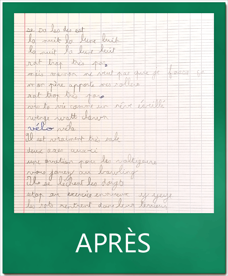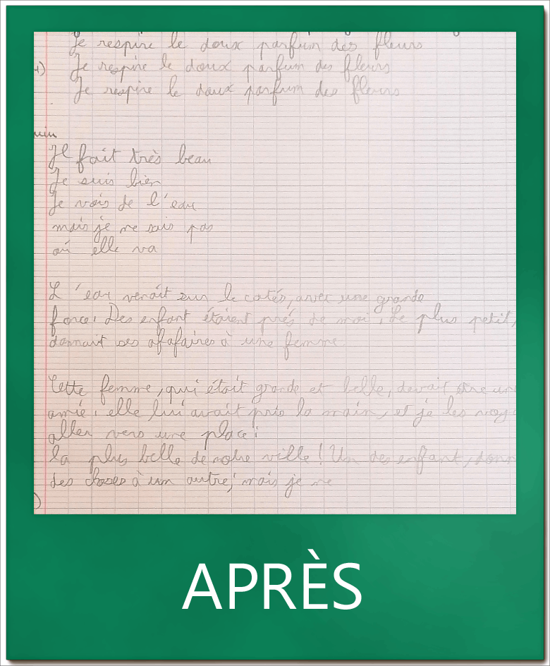A la fin de la rééducation A. a retrouvé une vitesse d’écriture dans la moyenne haute des enfants de sa classe d’âge. C’est légèrement inférieur aux résultats de début d’accompagnement mais la clarté des écrits s’est nettement améliorée.