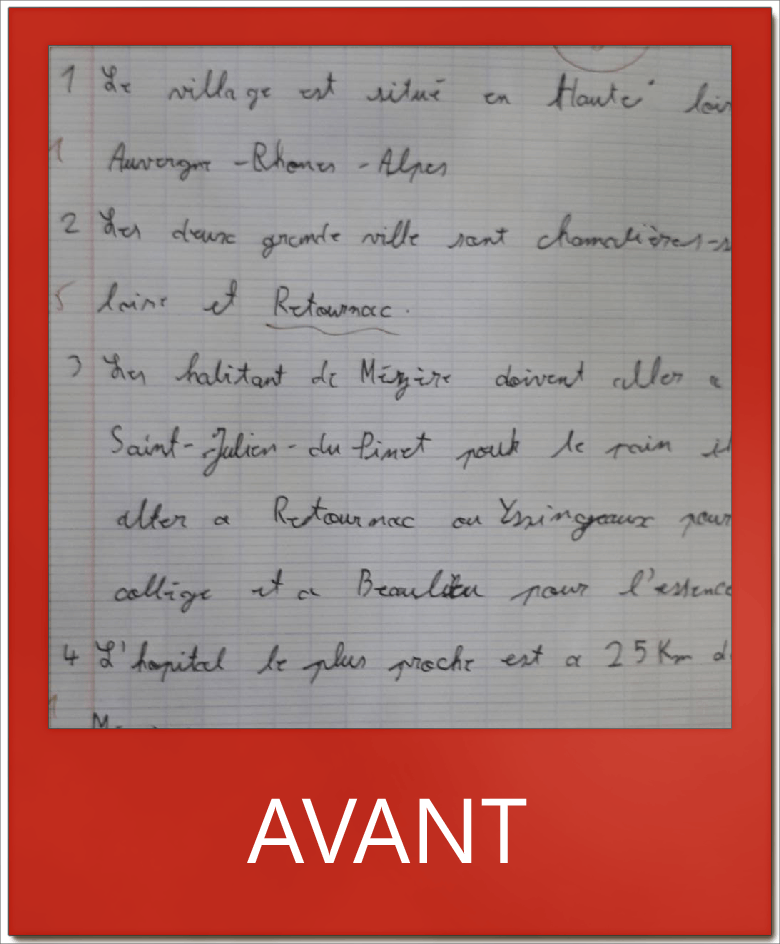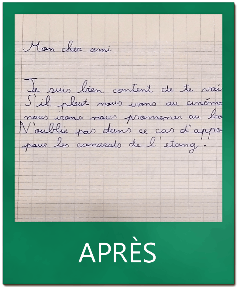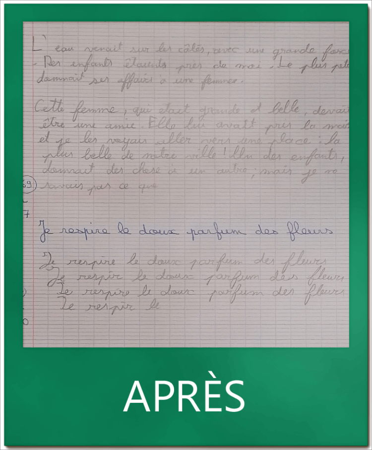 Les exercices m’ont bien aidé pour les formes des lettres par exemple le ‘t’ que j’ouvrais trop, le ‘e’ que je ne faisais pas en boucle, le ‘a’ et le ‘o’ qu’on confondait et le pont quand il y avait 2 ‘m’ d’affilée, parfois je faisais 4 ponts et 2 ponts. »
