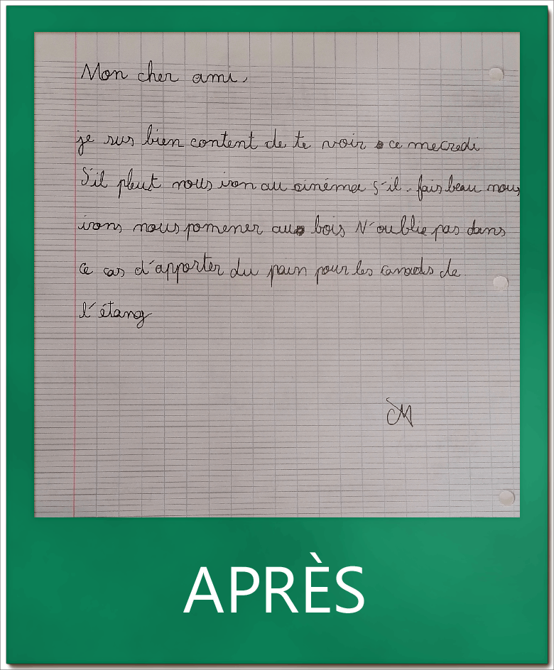 Il a appris à tracer les ‘p’ en un seul mouvement, à enchaîner les ‘s’, à réduire la taille des chiffres et à mieux négocier les enchaînements difficiles comme le ‘br’ ou le ‘be’.