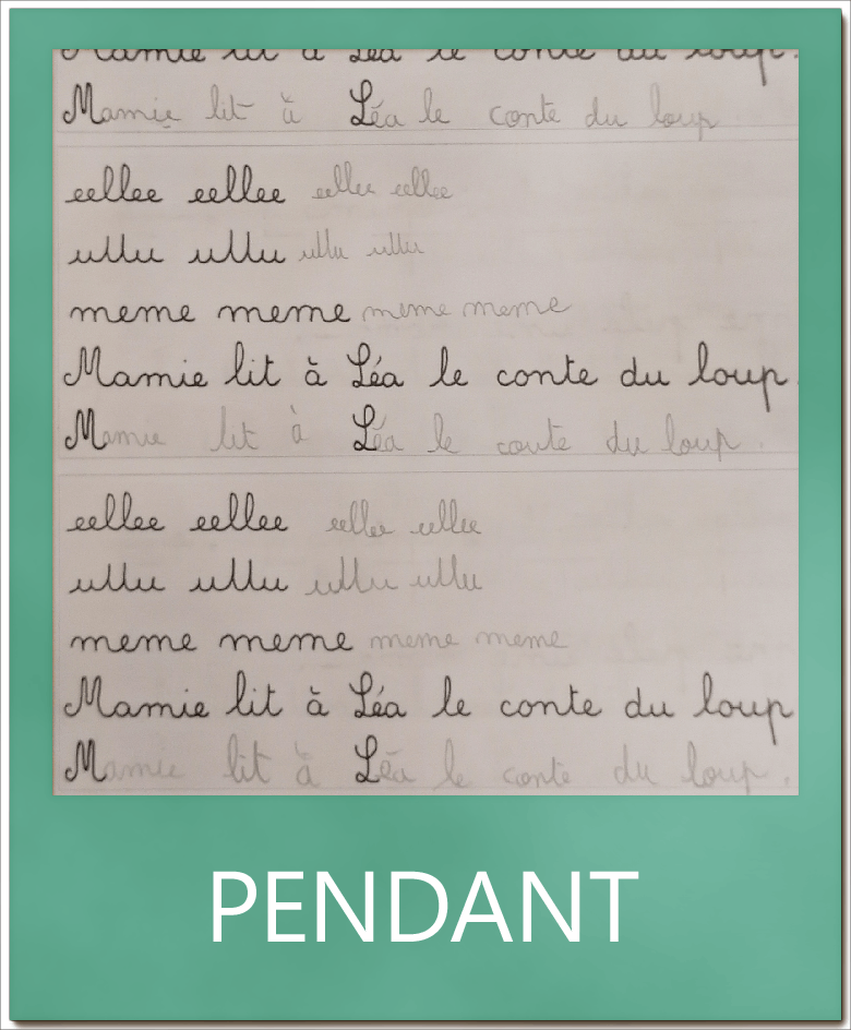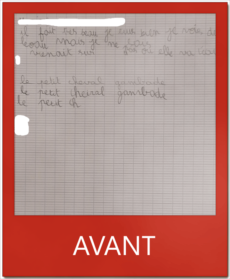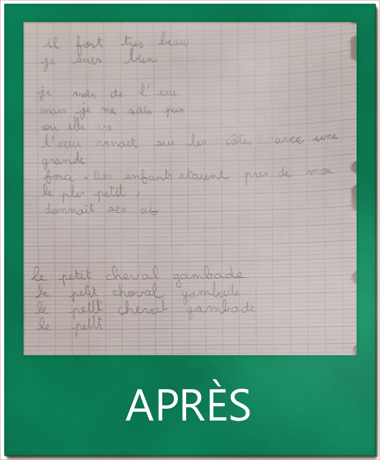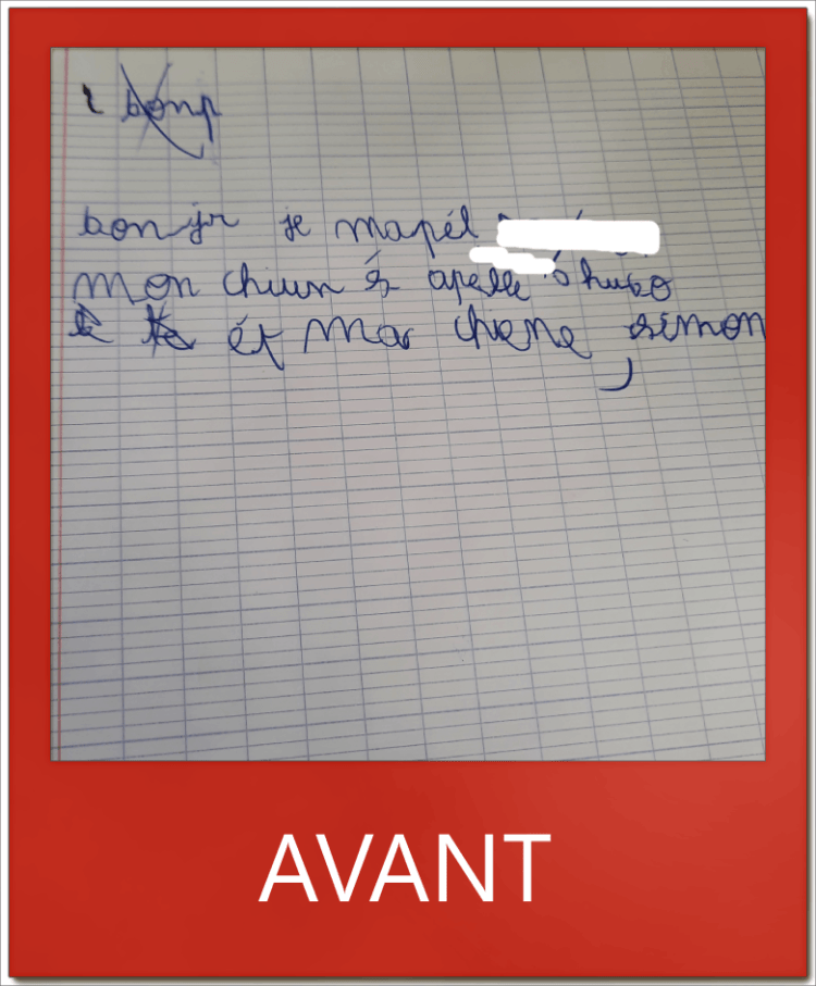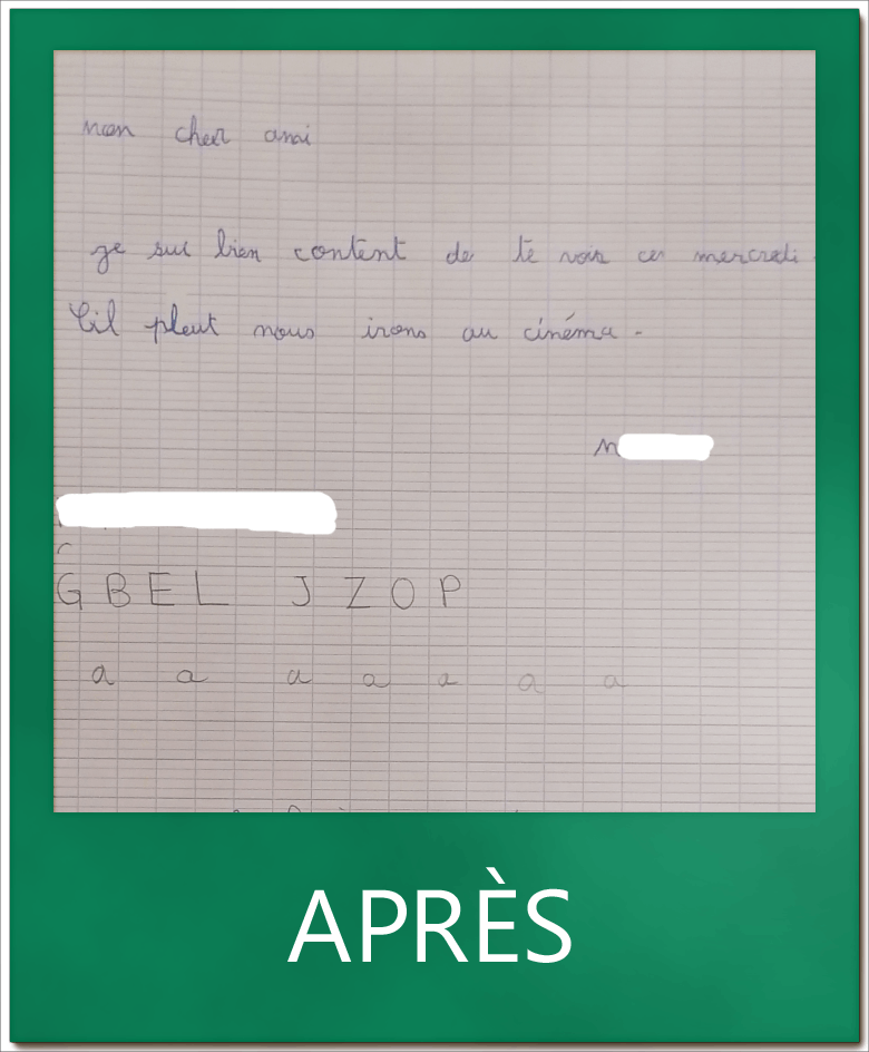M. élève en CE1, avait mal appris à écrire et ne savait pas comment tenir son crayon. En quelques leçons, il a pu corriger cela et se dépasser tant en vitesse qu’en qualité d’écriture.