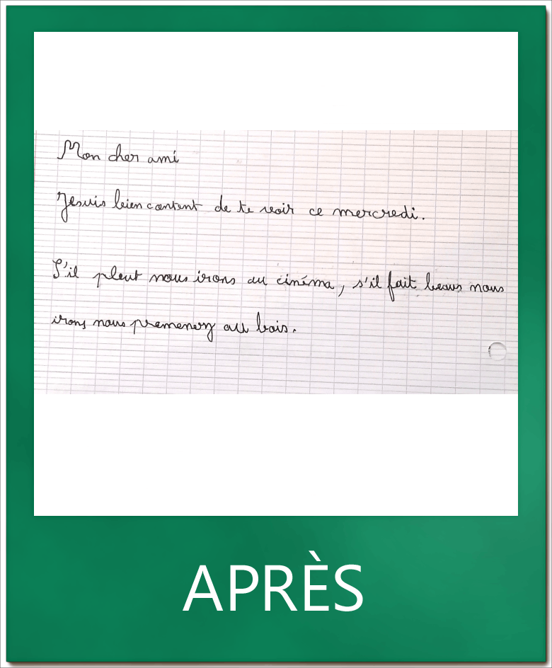 L. 9 ans a été très sérieux tout au long de la rééducation. Il a su ainsi réguler son écriture, aujourd’hui plus fluide, rapide et lisible.