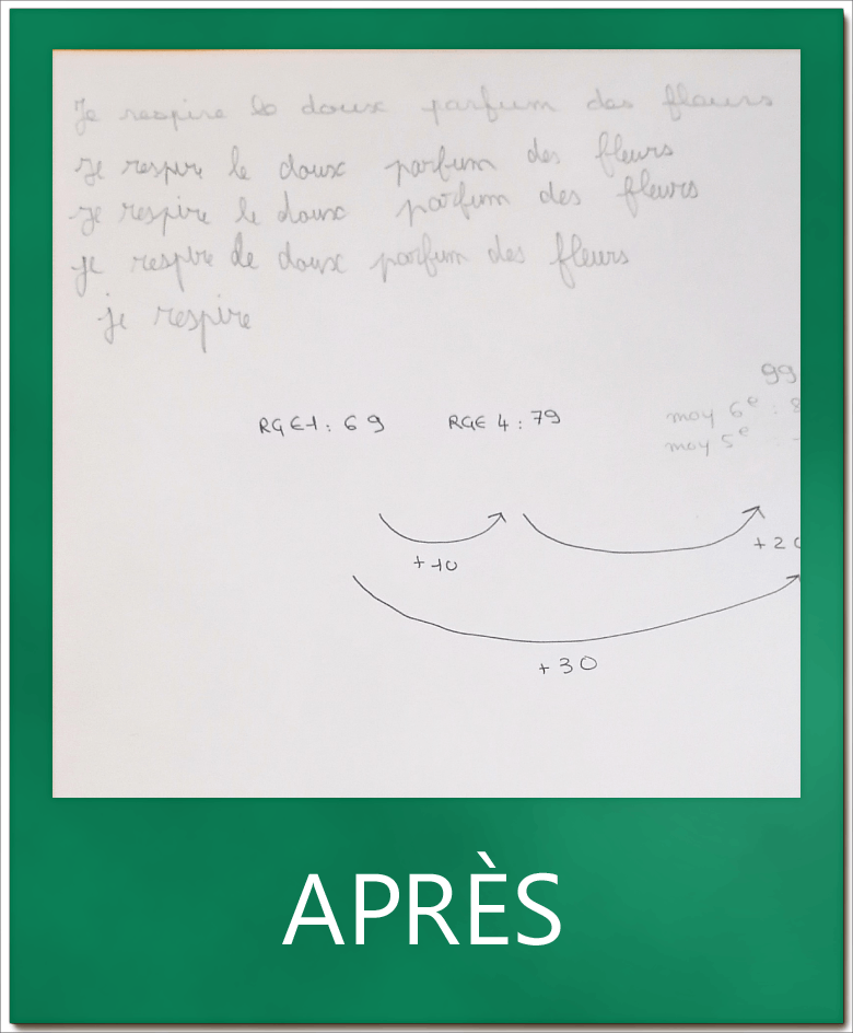 J. appliquait le + possible au collège ce que nous faisions au fur et à mesure. Ainsi les progrès en quelques séances ont été importants.