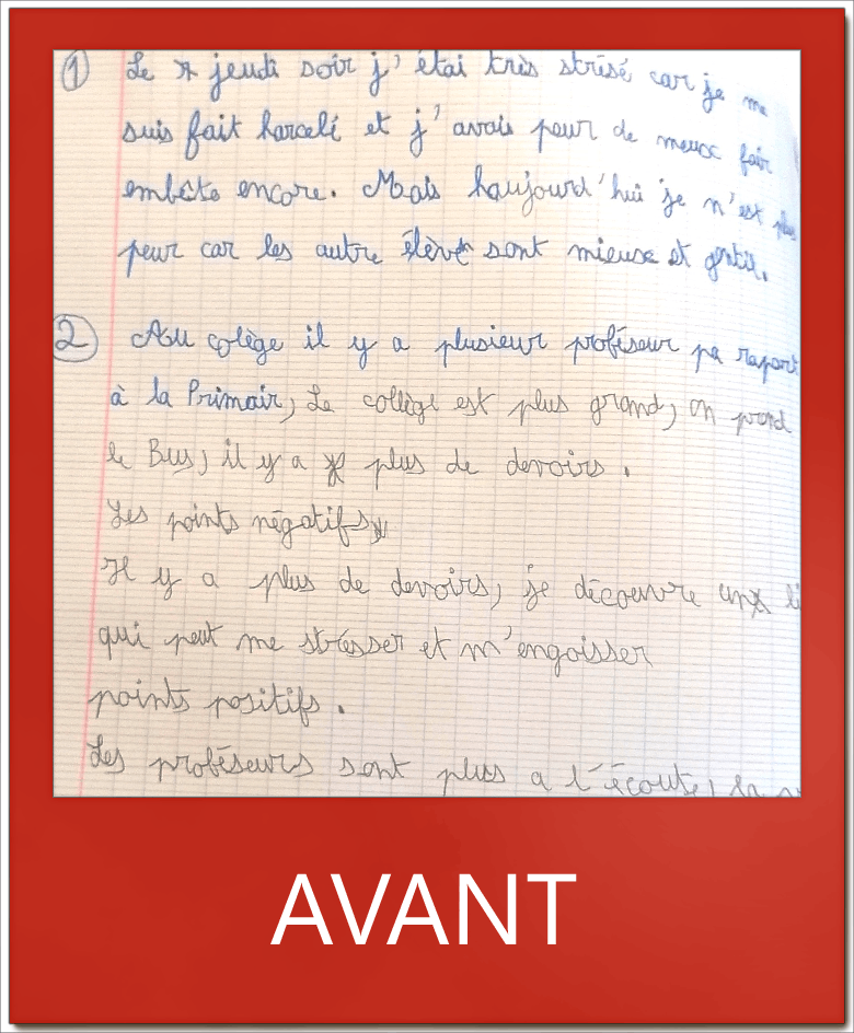 J. élève de 6ème avait besoin de retrouver une écriture efficace pour se donner toutes les chances au collège. L’objectif 1er a été de le soulager de ses douleurs lorsqu’il écrivait. Objectif atteint : écrire ne doit pas faire mal !
