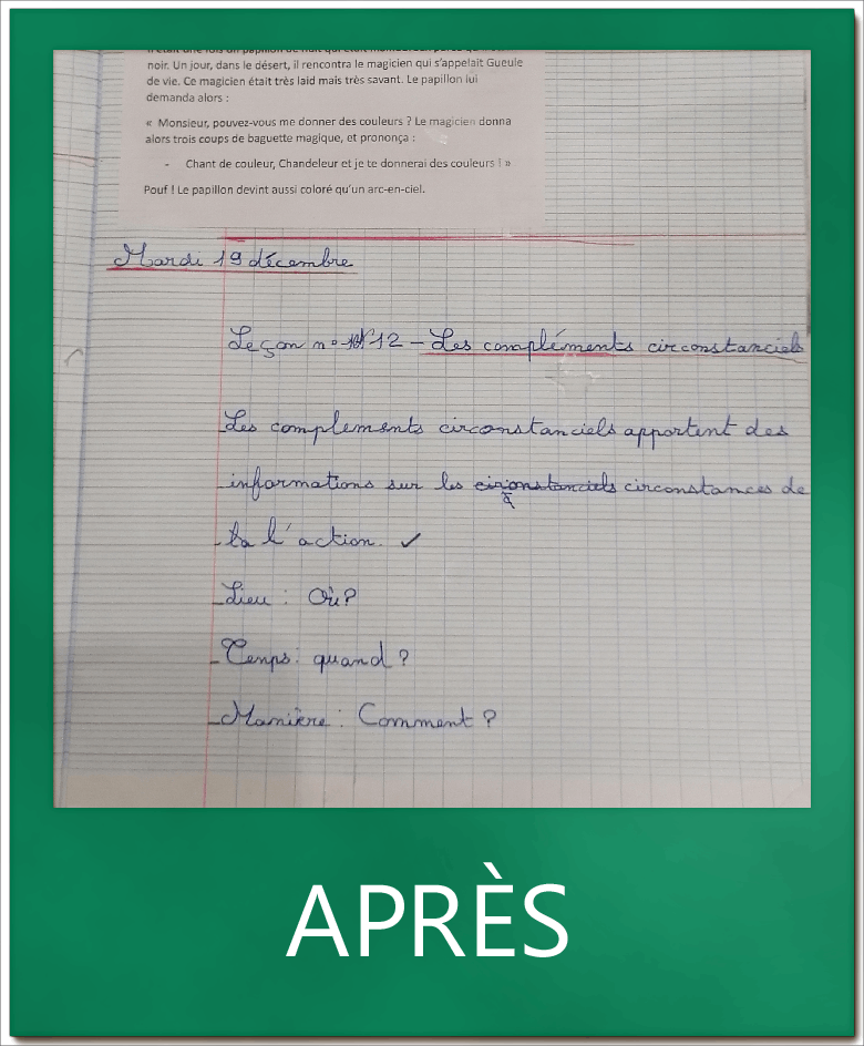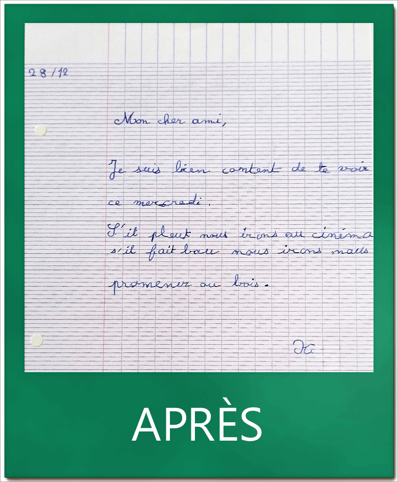 K. élève en CE2 a suivi quelques séances pour améliorer son écriture. Il lui était difficile de lier les lettres les unes aux autres. Il a vite compris les règles de conduite de l’écriture et a su progresser. Bravo à lui !