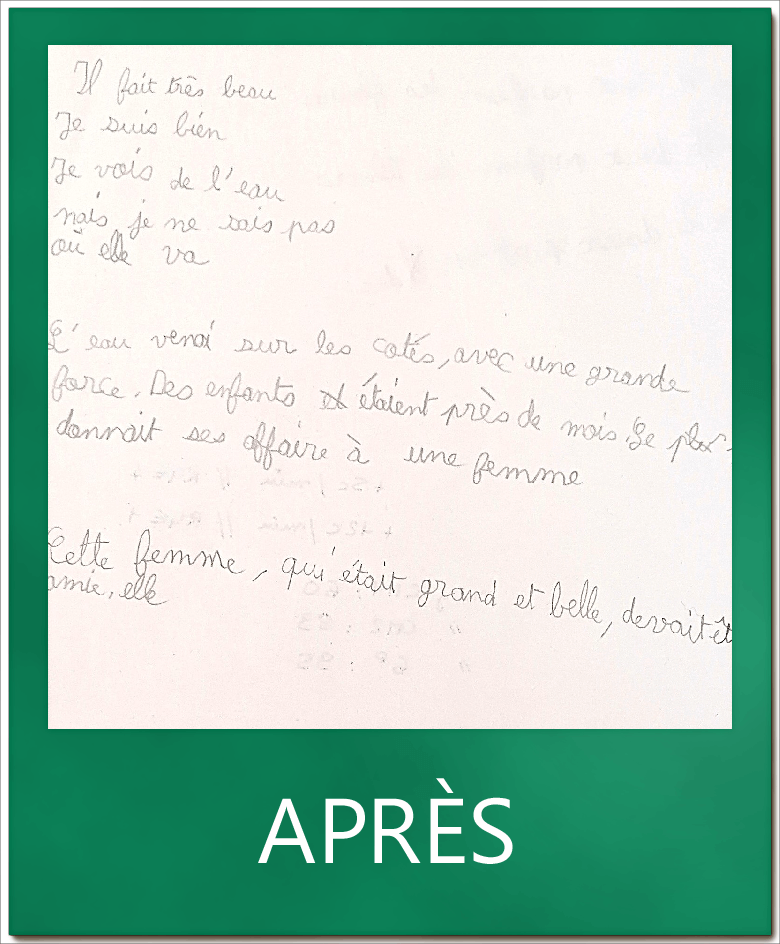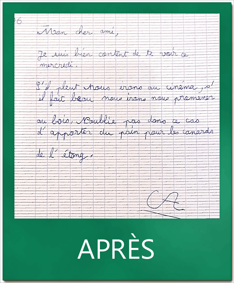 Une belle évolution pour cette jeune fille, qui sait maintenant comment bouger ses doigts pour une écriture régulière et fluide. Bonne continuation !