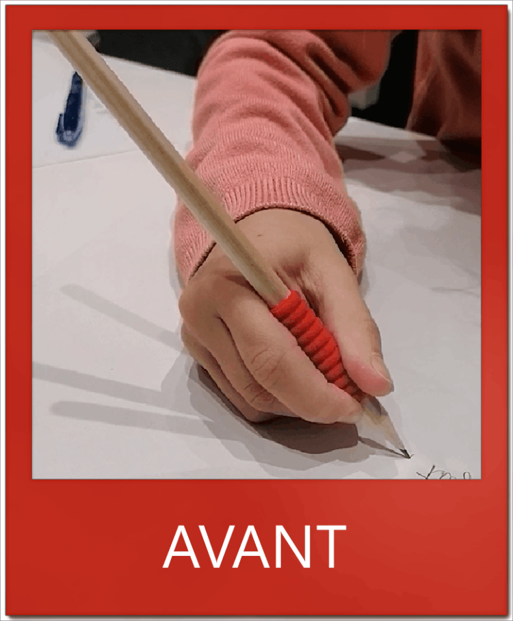 Beaucoup d’exercices ont été proposés afin de consolider cette pince et pour apprendre à bien positionner sa main par rapport à la ligne d’écriture (en dessous) et à pencher son support.