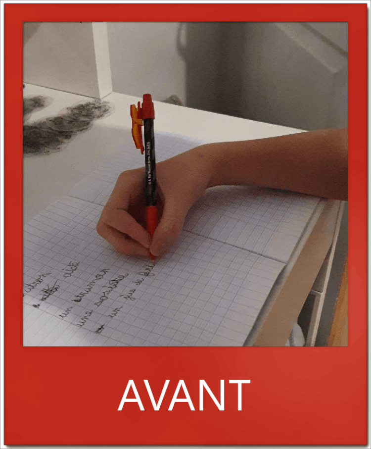 Au fur et à mesure de la rééducation, le crayon a laissé sa place au stylo roller, qui a permis à E. de répondre aux attentes du CM1. Une belle évolution !