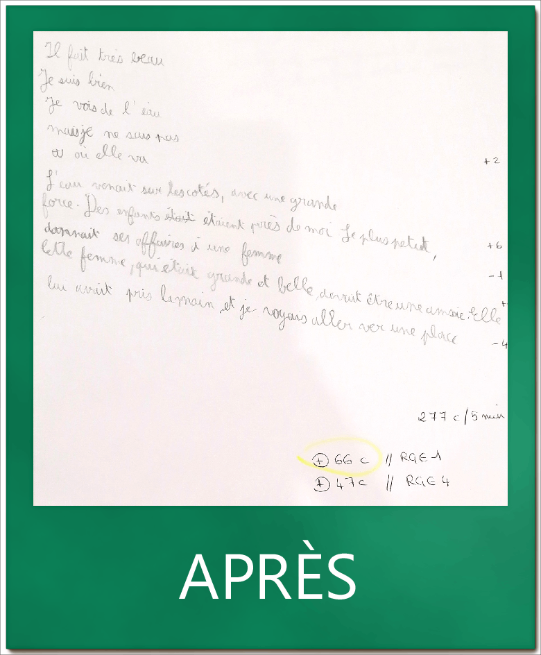 Une bonne évolution au niveau de la vitesse d’écriture. La moyenne en CM1 est fixée à 224, en CM2 à 229 et un bond en 6ème avec 317 caractères copiés en 5 minutes.