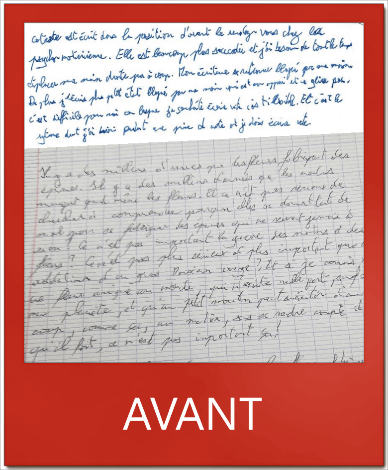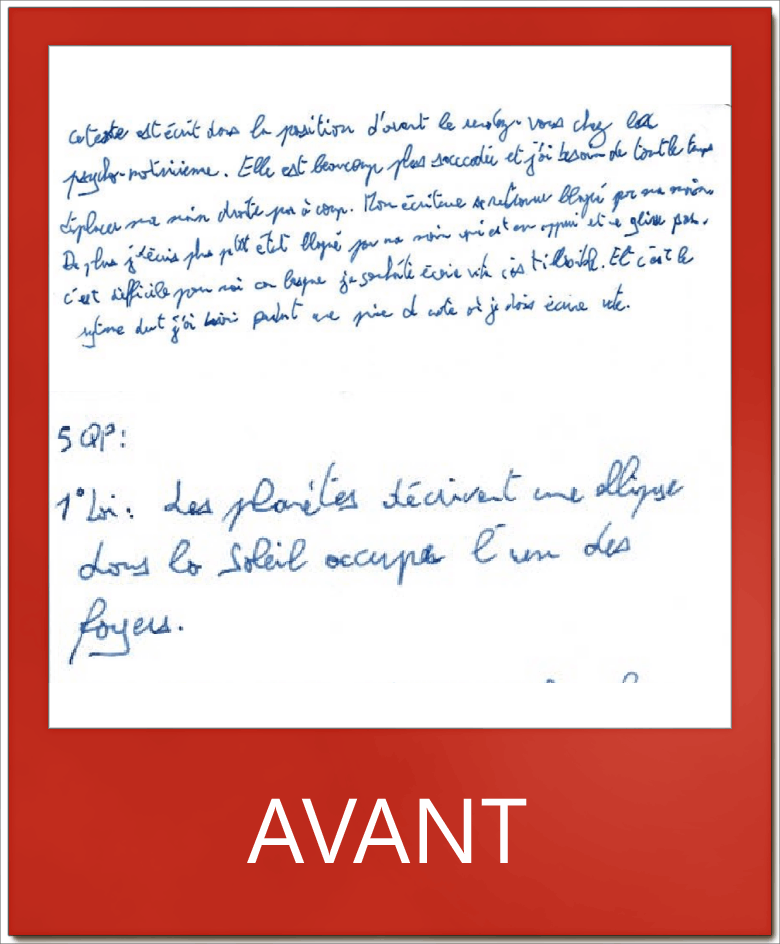 Cependant au niveau de la quantité, N. n’est pas parvenu à égaler ses résultats d’avant. Un bilan d’ergothérapie menait en amont de la rééducation du geste d’écriture a permis d’effectuer une demande de 1/3 temps pour les examens.