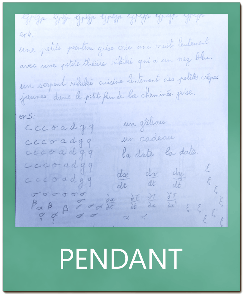 Claire m’a permis de changer, ma prise de crayon, la position de la feuille, ma posture etc.J’aime enfin… mon écriture lisible…et belle !!!