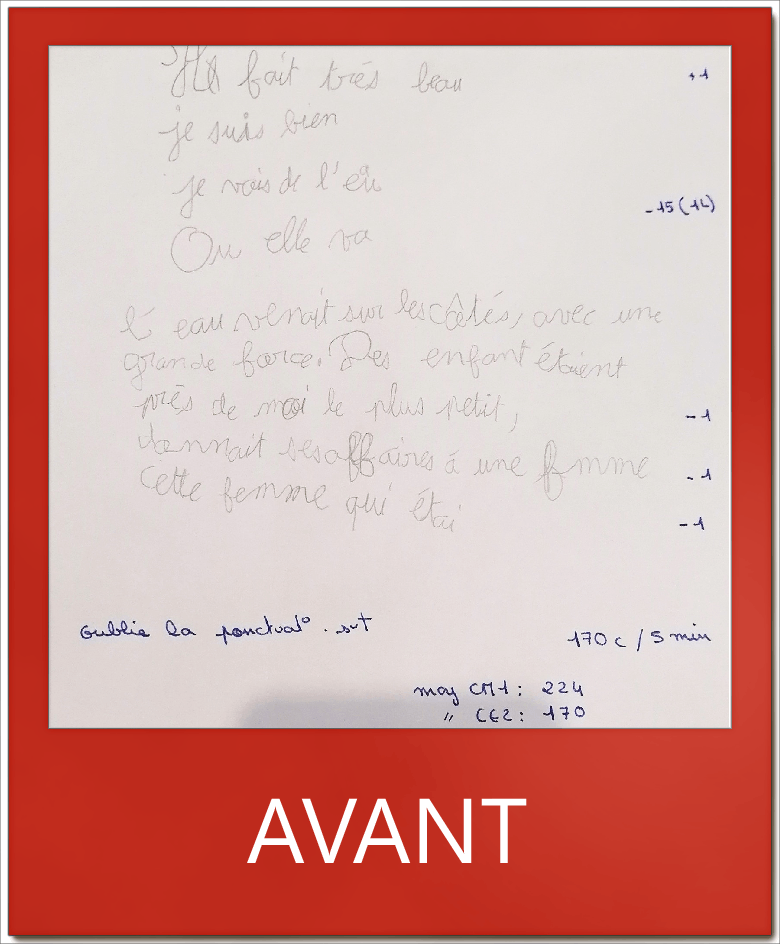 Ainsi + 78 caractères en copie de texte et une nette amélioration des stratégies de copie. La 1ère fois, G. avait oublié 1 ligne entière sans s’en rendre compte. C’est un axe qu’il doit continuer à travailler pour encore améliorer sa copie et sa prise de notes.