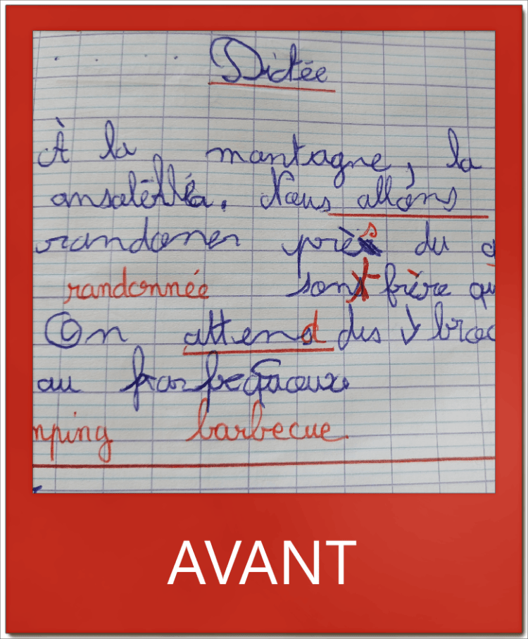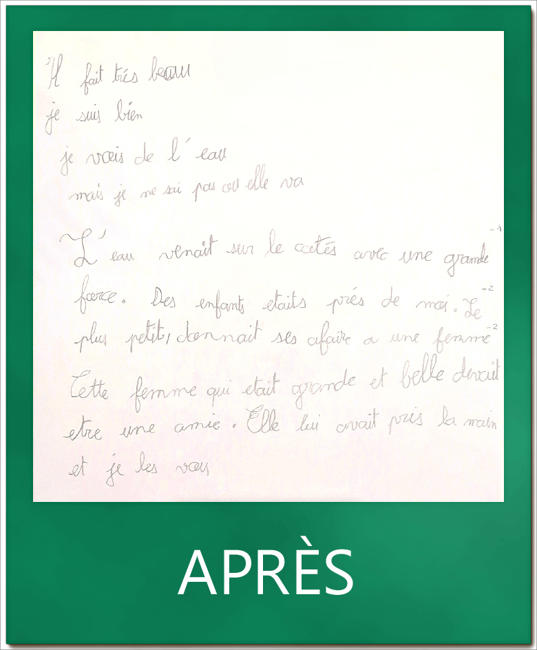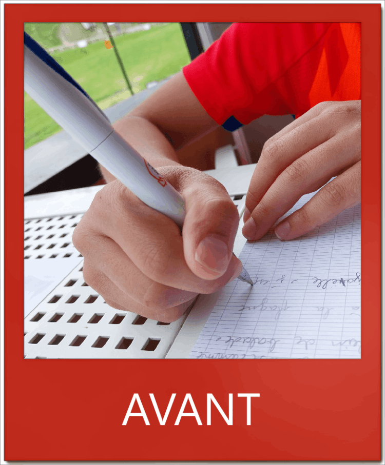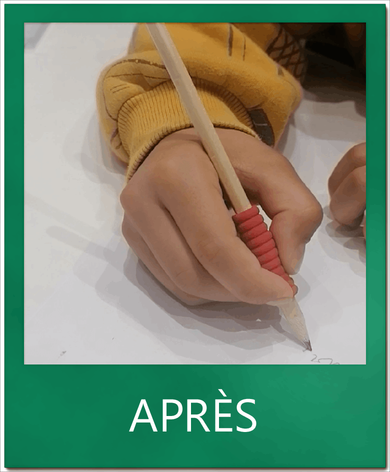 En quelques séances, la position s’est améliorée et avec elle le confort d’écriture. Il est important aussi d’échanger sur la position générale : les pieds bien à plat, la coude sur la table afin d’éviter toute tension.
