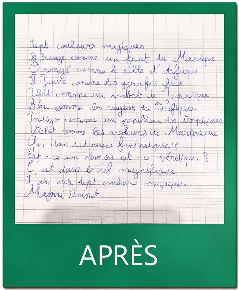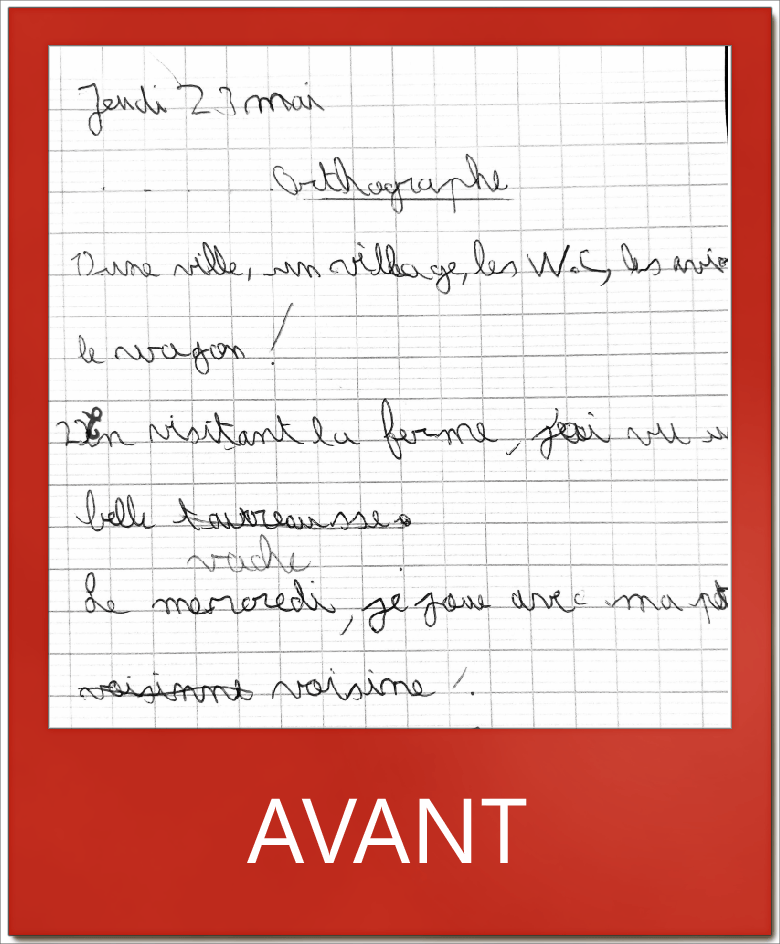 Mon écriture est beaucoup mieux que la 1ère fois où je suis venu : c’est moins gros mais je prends plus de temps en dictée. «