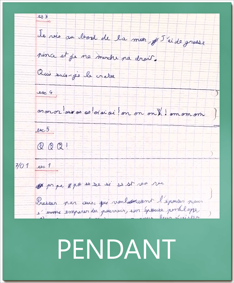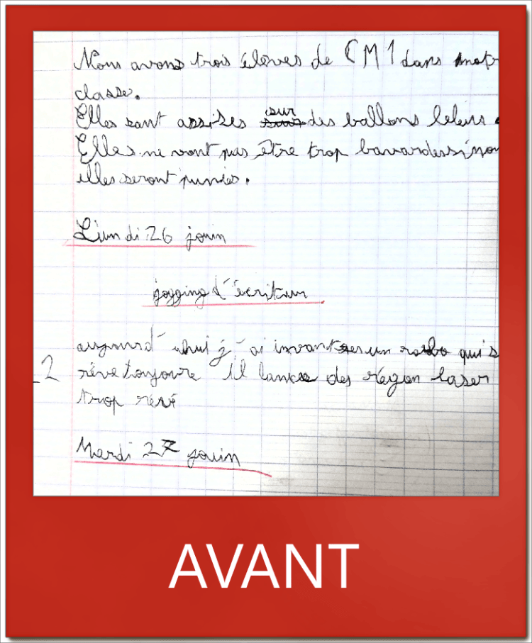 F. 10 ans, connaissait des difficultés d’écriture depuis le CP. Arrivé en CE2, il était très difficile de le relire et F. avait beaucoup de mal à suivre le rythme. En quelques mois il a pu écrire vite et bien. Félicitations !