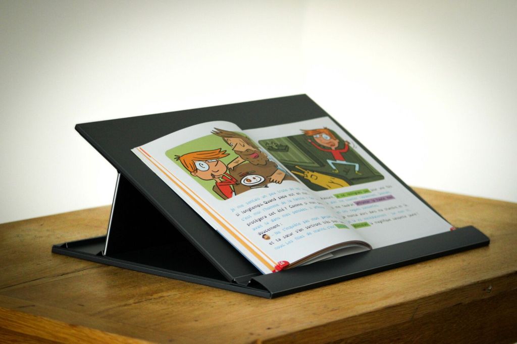 Vous pouvez aussi fabriquer un pupitre de lecture vous-même : tuto. L’avantage de celui-ci, c’est qu’il est transportable !