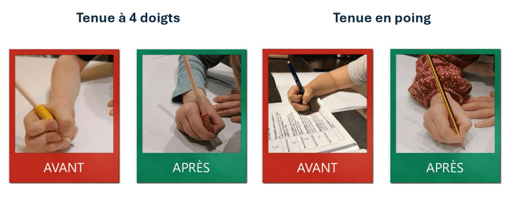 Aïe, aïe, aïe !!! Des enfants qui se sont habitués à écrire avec des positions qui engendrent crispations et douleurs constantes, au niveau des doigts et du poignet. Pour certains, les douleurs peuvent remonter dans l’épaule et le cou.