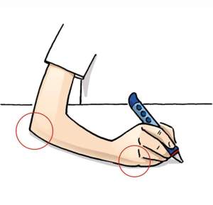 - La main et le bras : Le poignet ne doit pas être cassé, mais dans l’alignement de l’avant-bras. L’avant-bras repose sur la table.