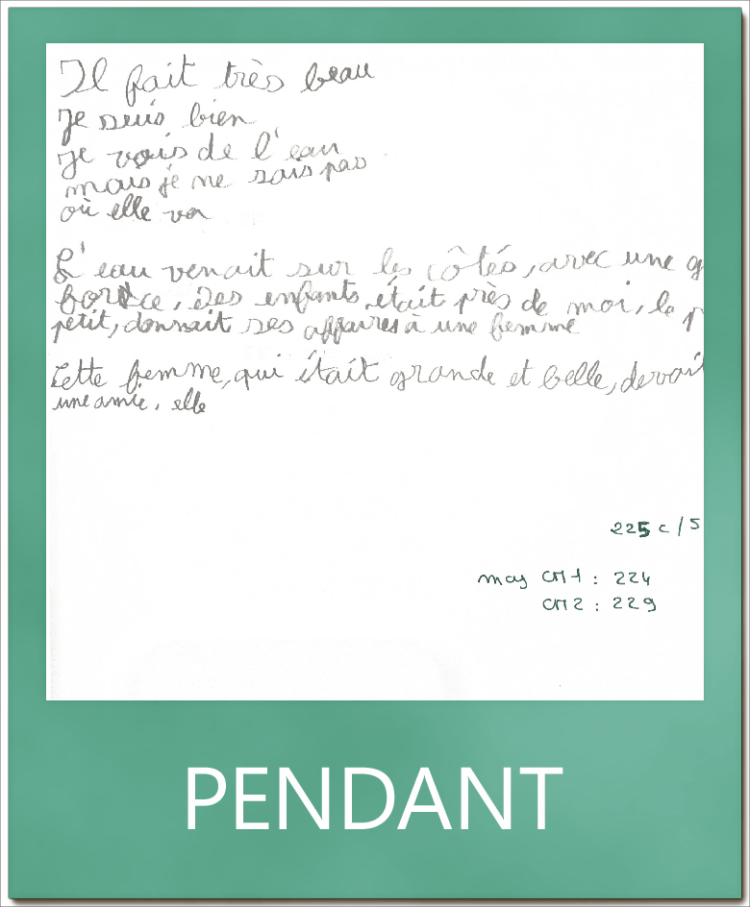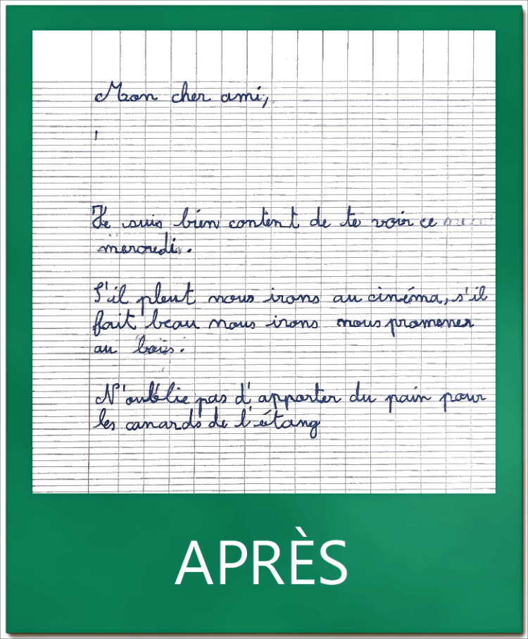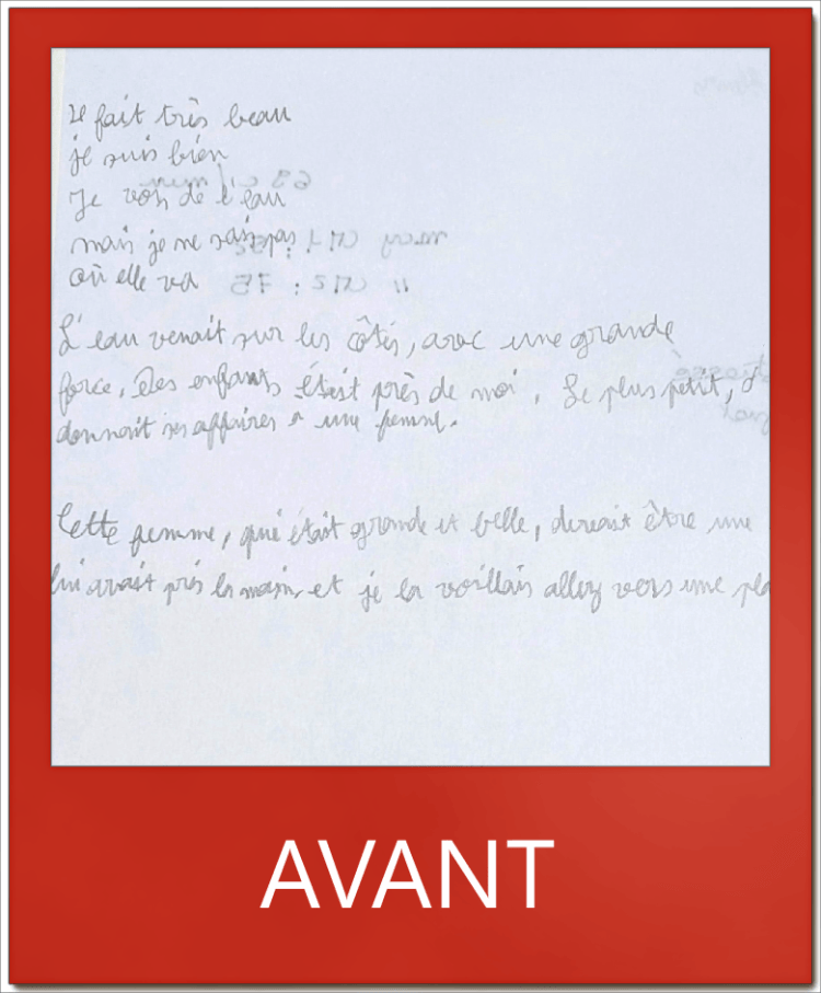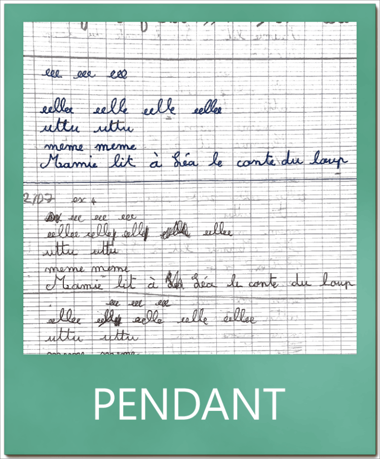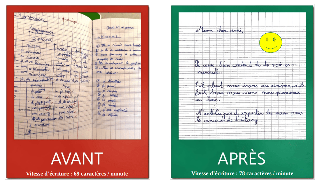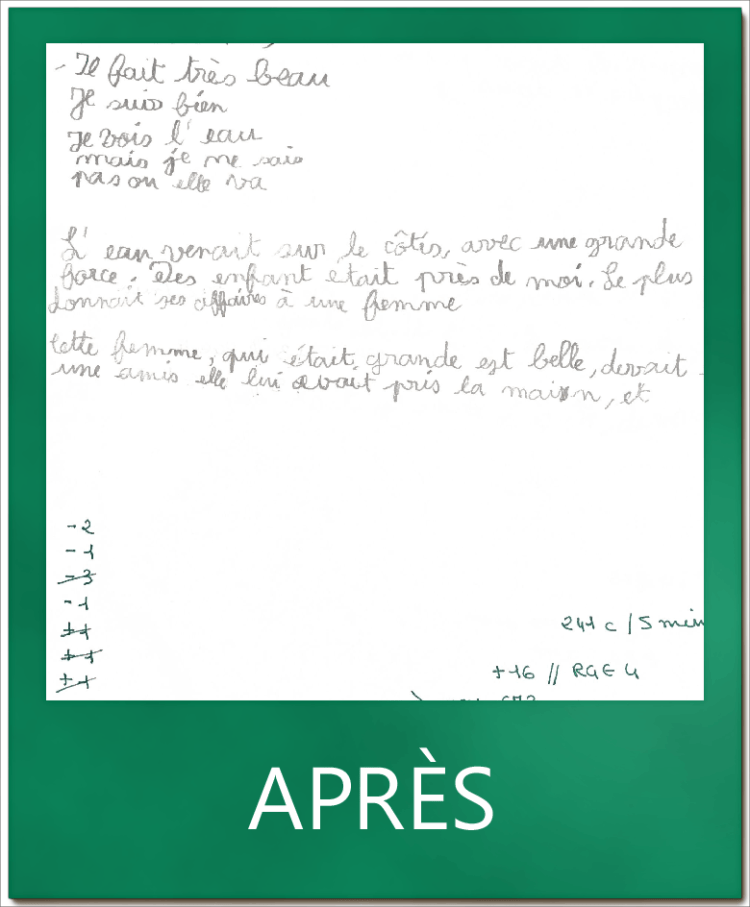 Ci-dessous des vignettes montrant l’évolution en terme de qualité et de quantité sur un même test : la copie d’un texte en 5 minutes.